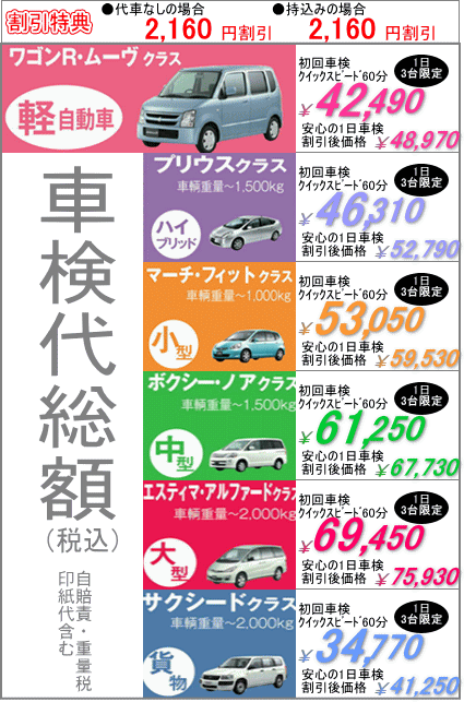 ◎車検代総額には依頼整備・部品油脂代は含まれておりません。